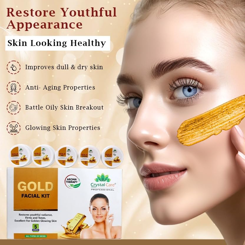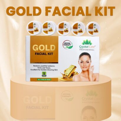 Crystal Care Professional Gold Facial Kit (5 Steps) is a premium gold facial kit for glowing skin, enriched with natural ingredients and gold extracts. This professional facial kit deeply cleanses, exfoliates, brightens, and rejuvenates dull skin. Perfect facial kit for women and men, it helps in skin whitening, anti-ageing, tan removal, and instant glow. Ideal for bridal facial, party facial, and home spa treatments, suitable for all skin types.
